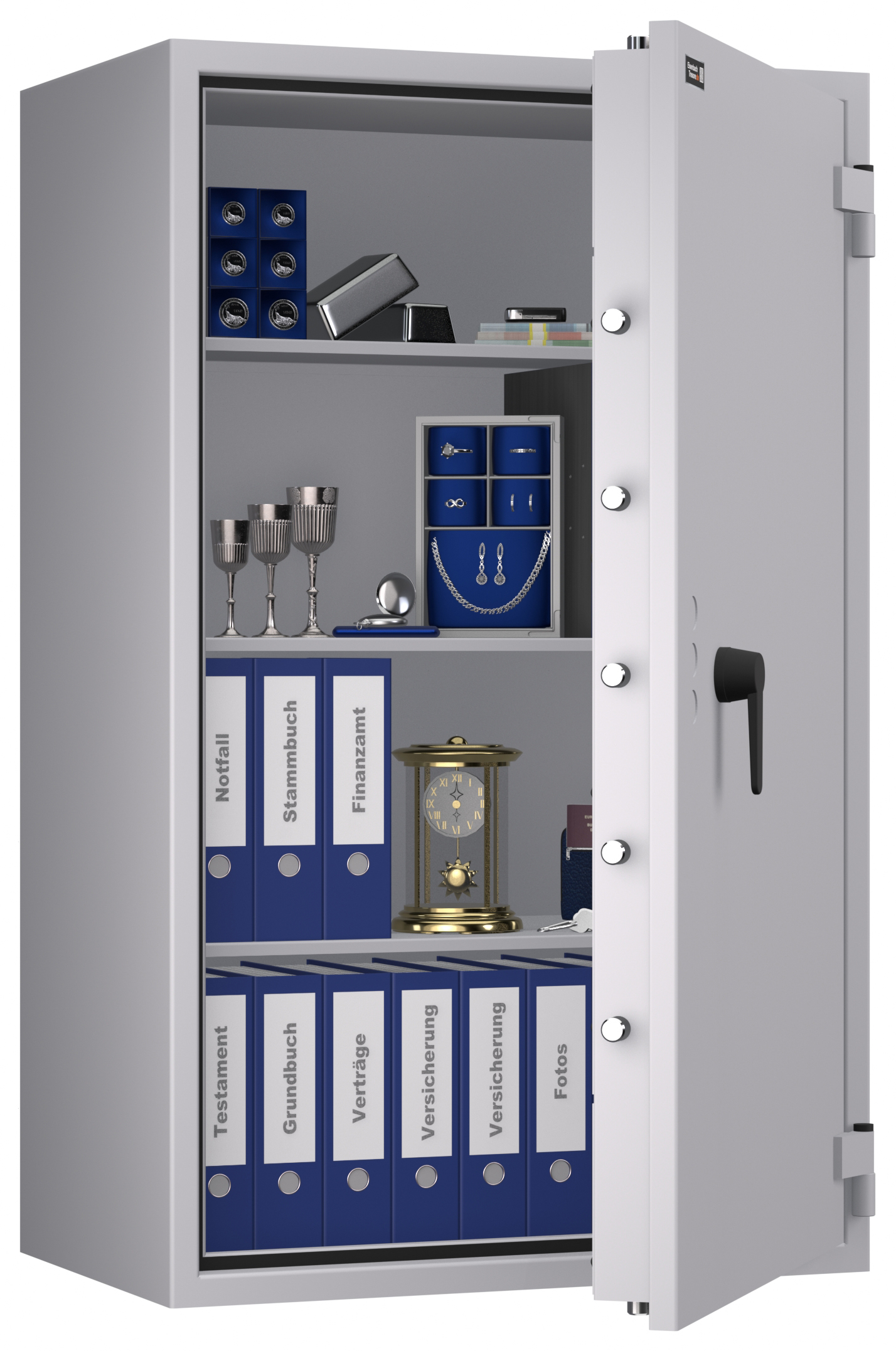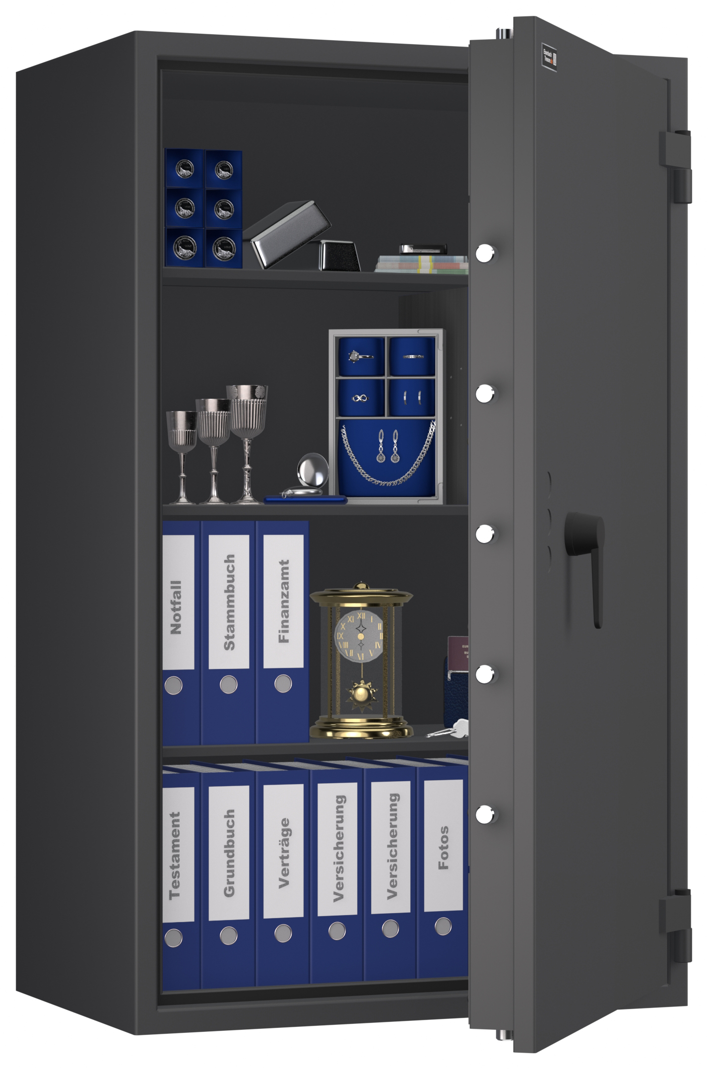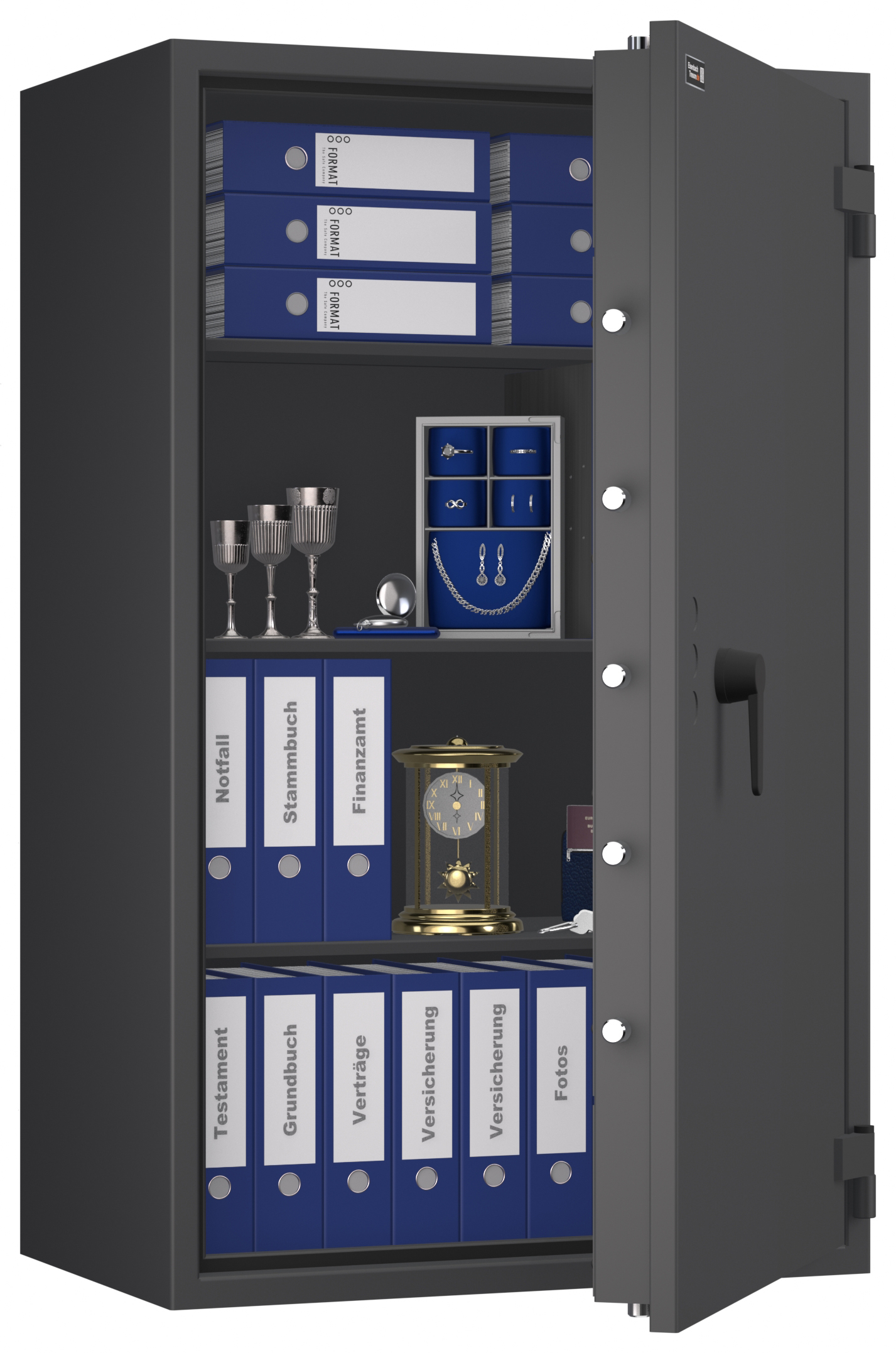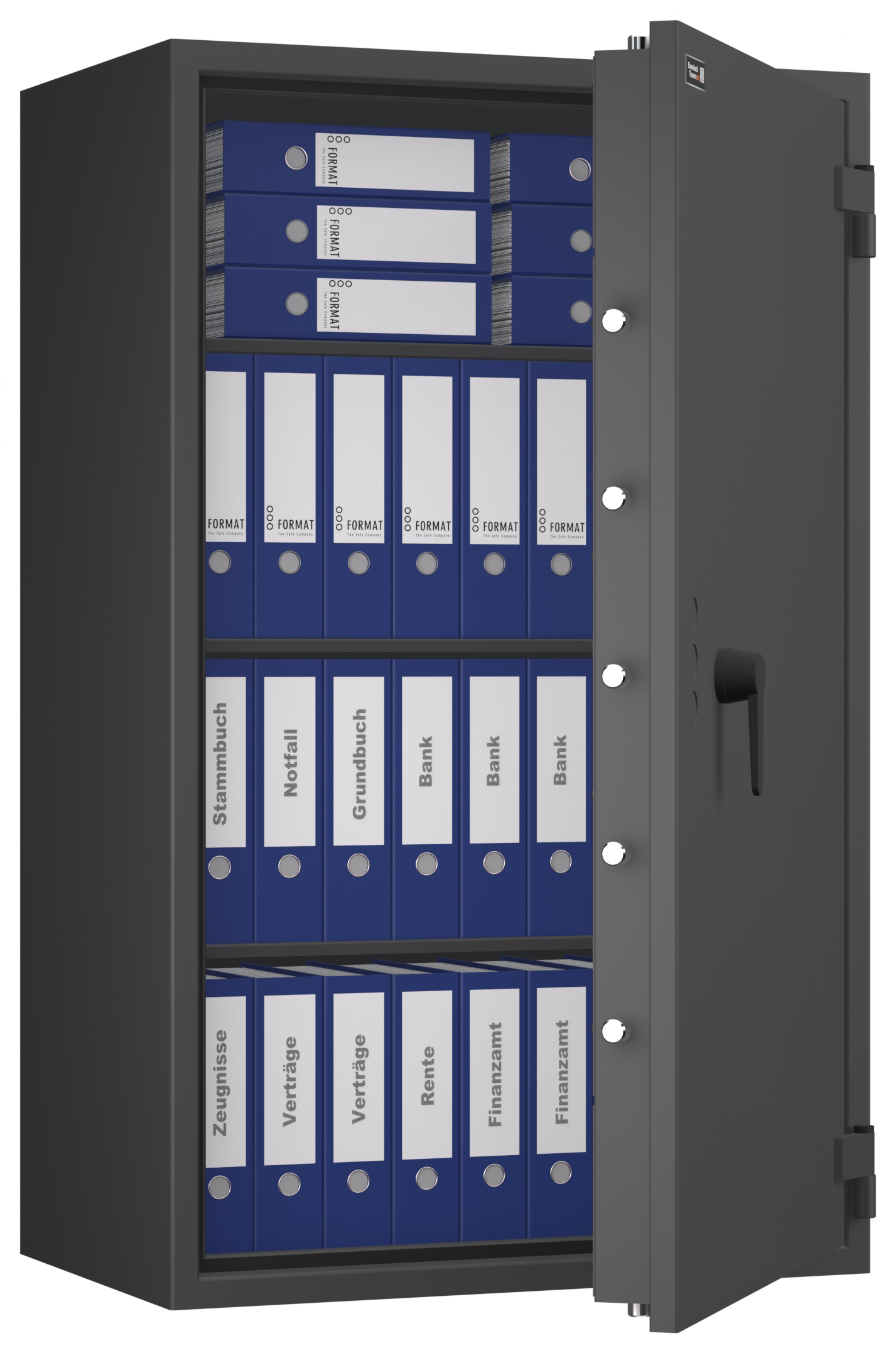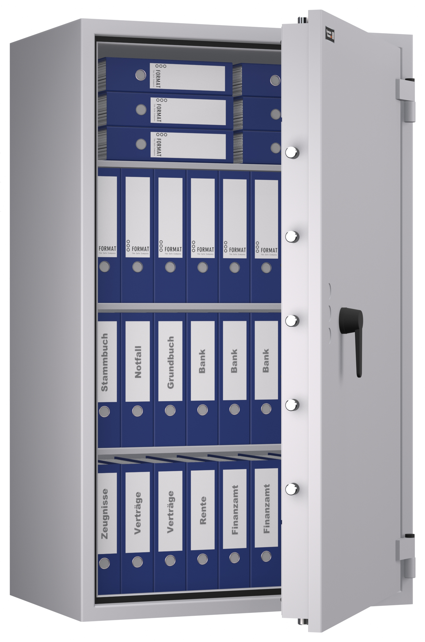 - Höchst widerstandsfähige Türfront und Korpus gegen Angriffe mit mechanischen und thermischen Einbruchwerkzeugen