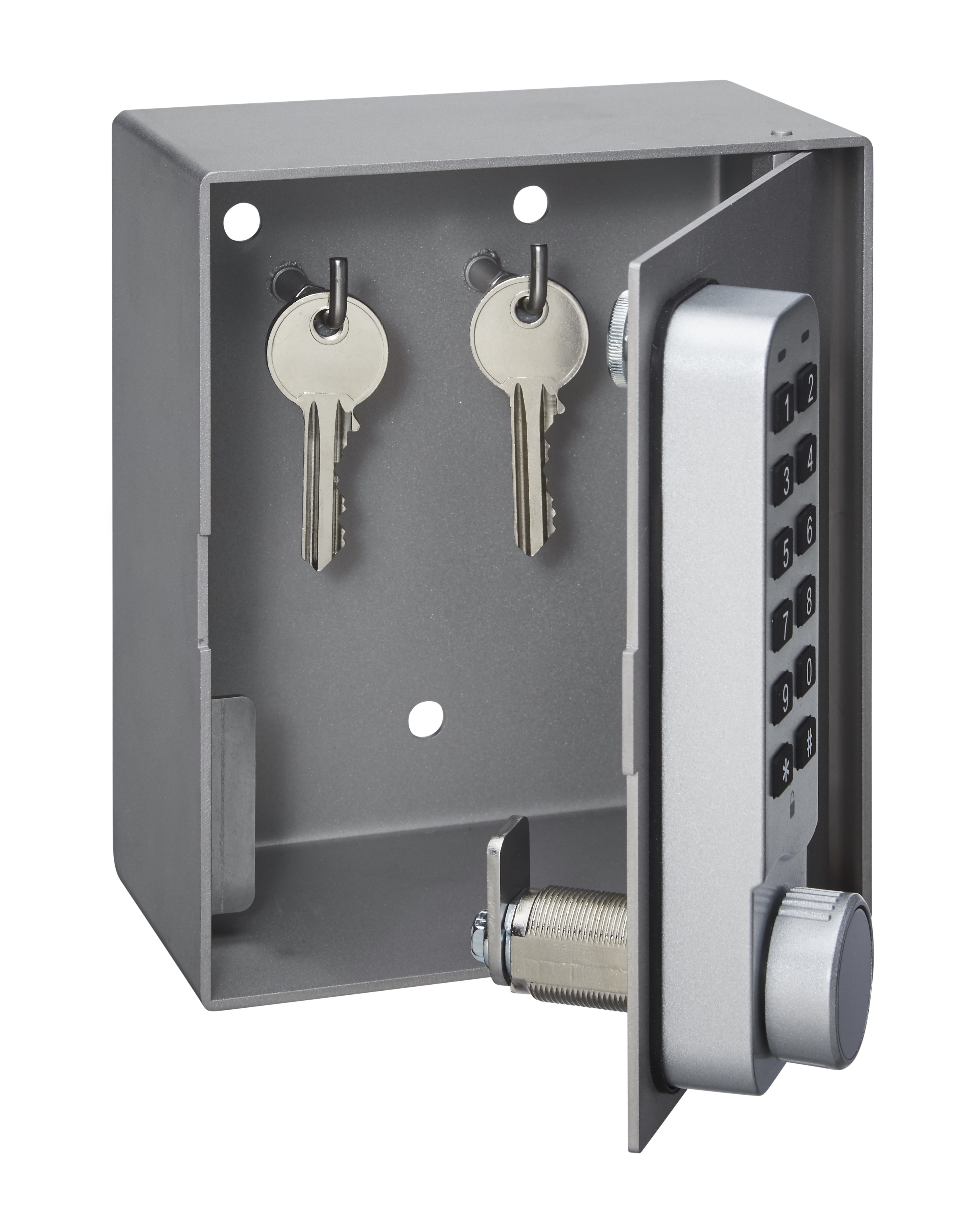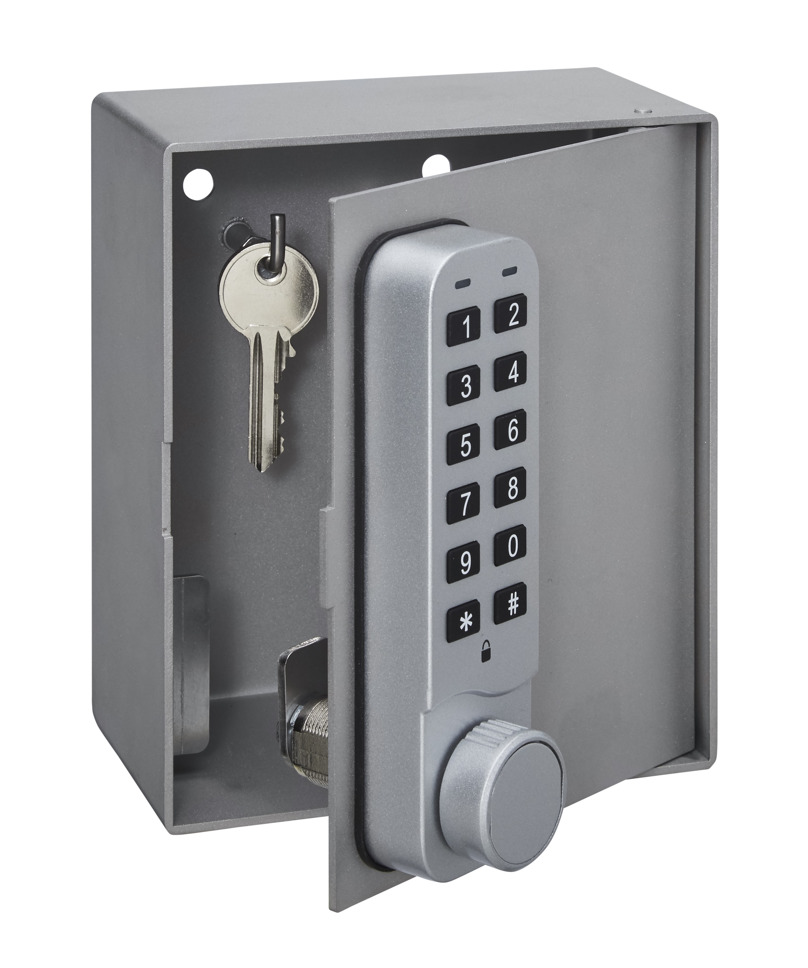CODE Schlüsselbox aus Edelstahl für die flexible Schlüsselhinterlegung und -aufbewahrung (Nach DIN 14675). Mit batteriebetriebenem, netzunabhängigem Codeschloss zur Öffnung mittels 4-stelligem Benutzercode. An der Rückwand befinden sich 2 Haken zum Aufhängen des Objektschlüssels. Zur Wandbefestigung im Innen- oder geschützten Außenbereich. Mit mechanischer Notöffnungsfunktion (2 Notschlüssel). Schutzklasse: IP65