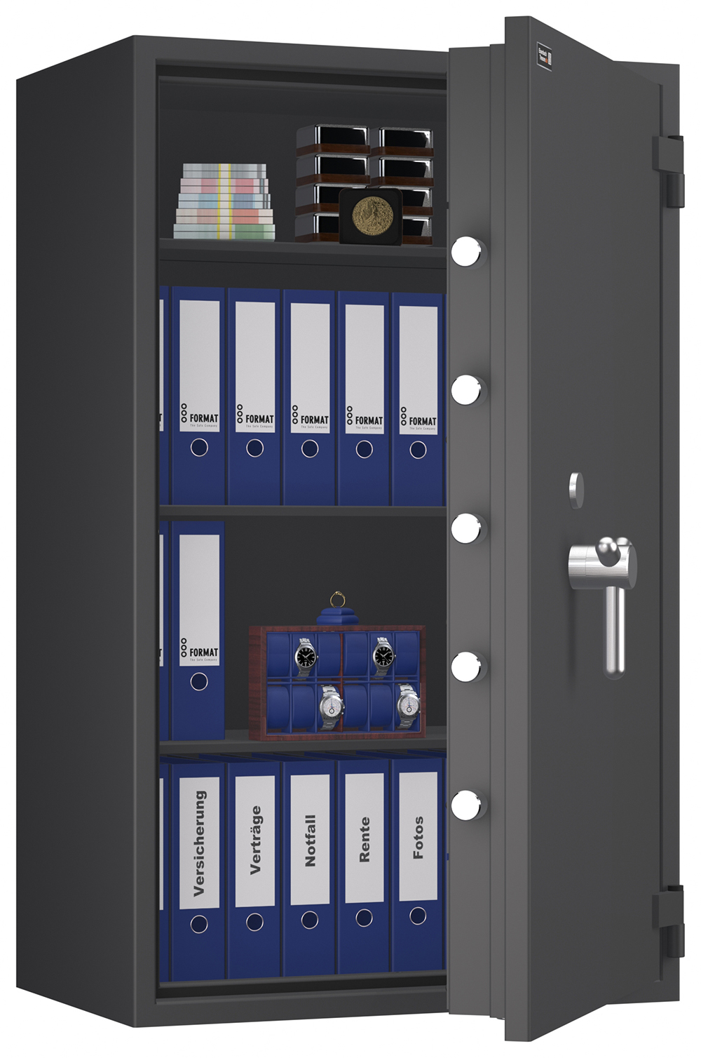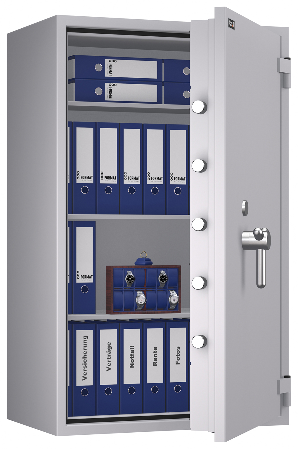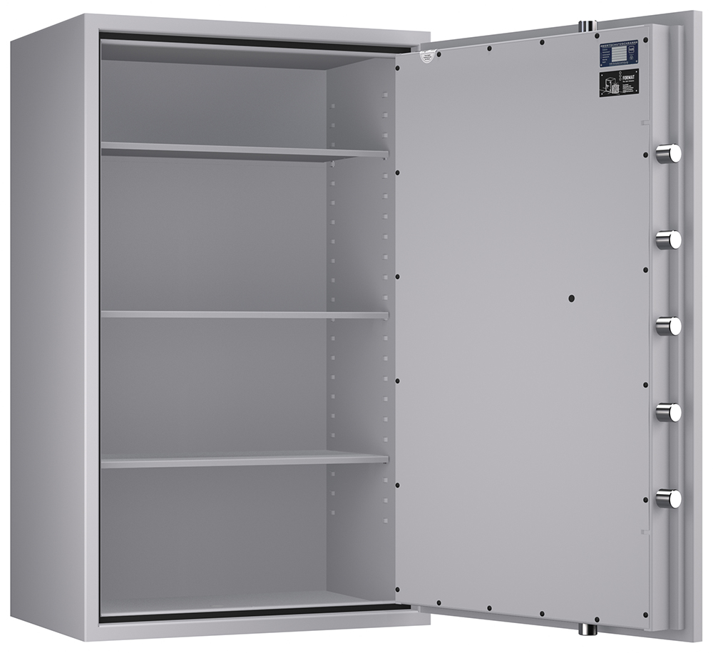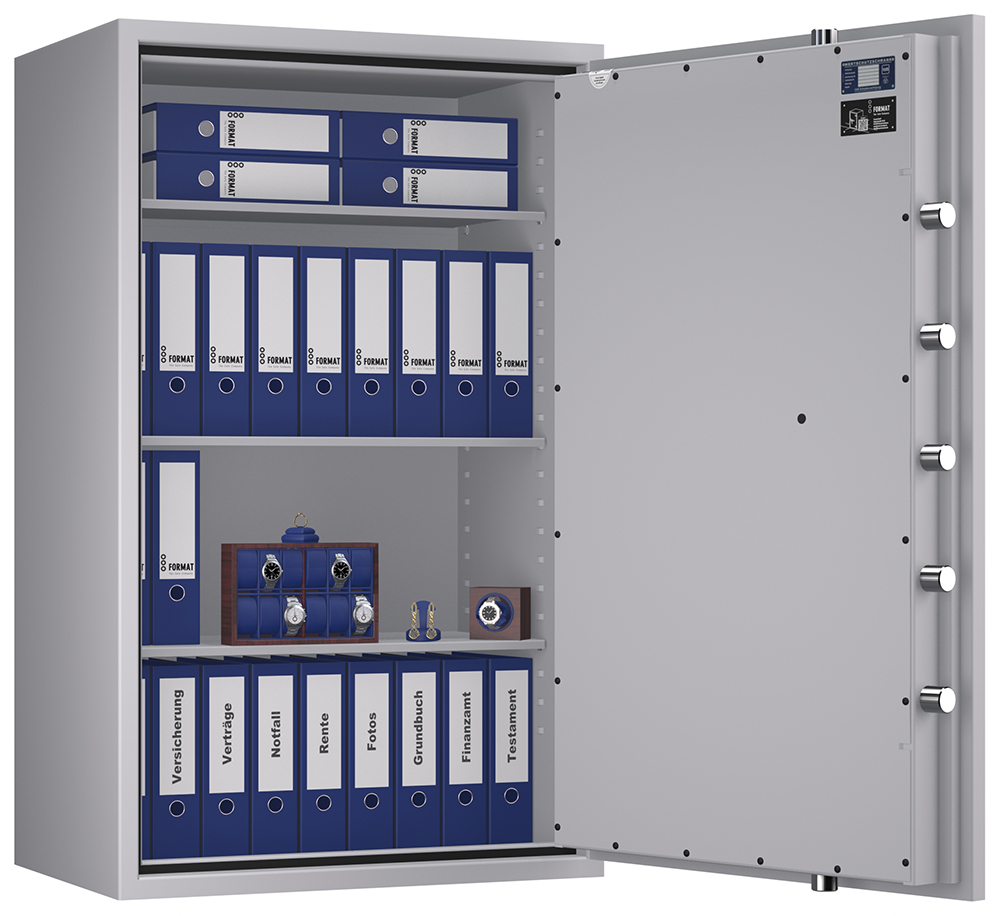 - Höchst widerstandsfähige Türfront und Korpus gegen Angriffe mit mechanischen und thermischen Einbruchwerkzeugen