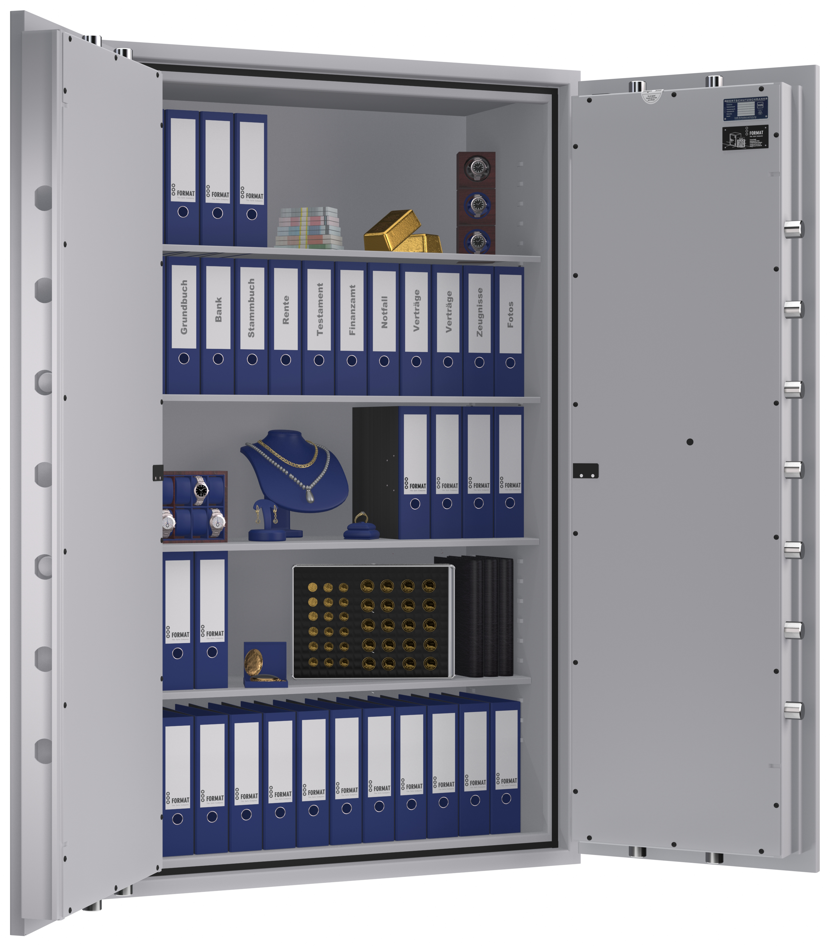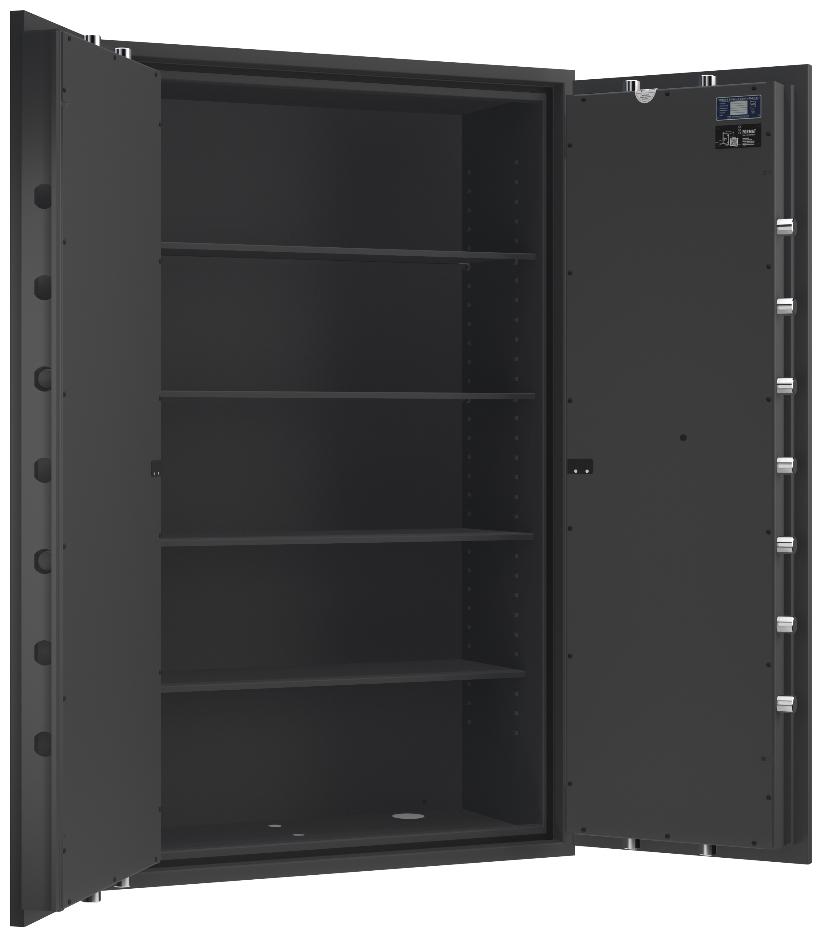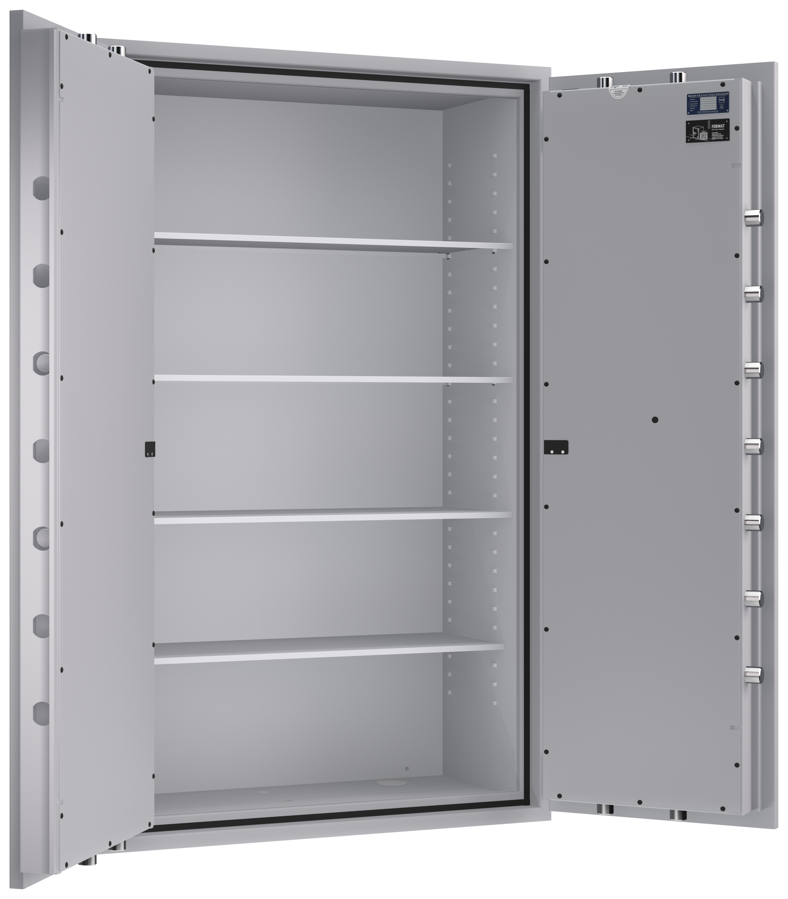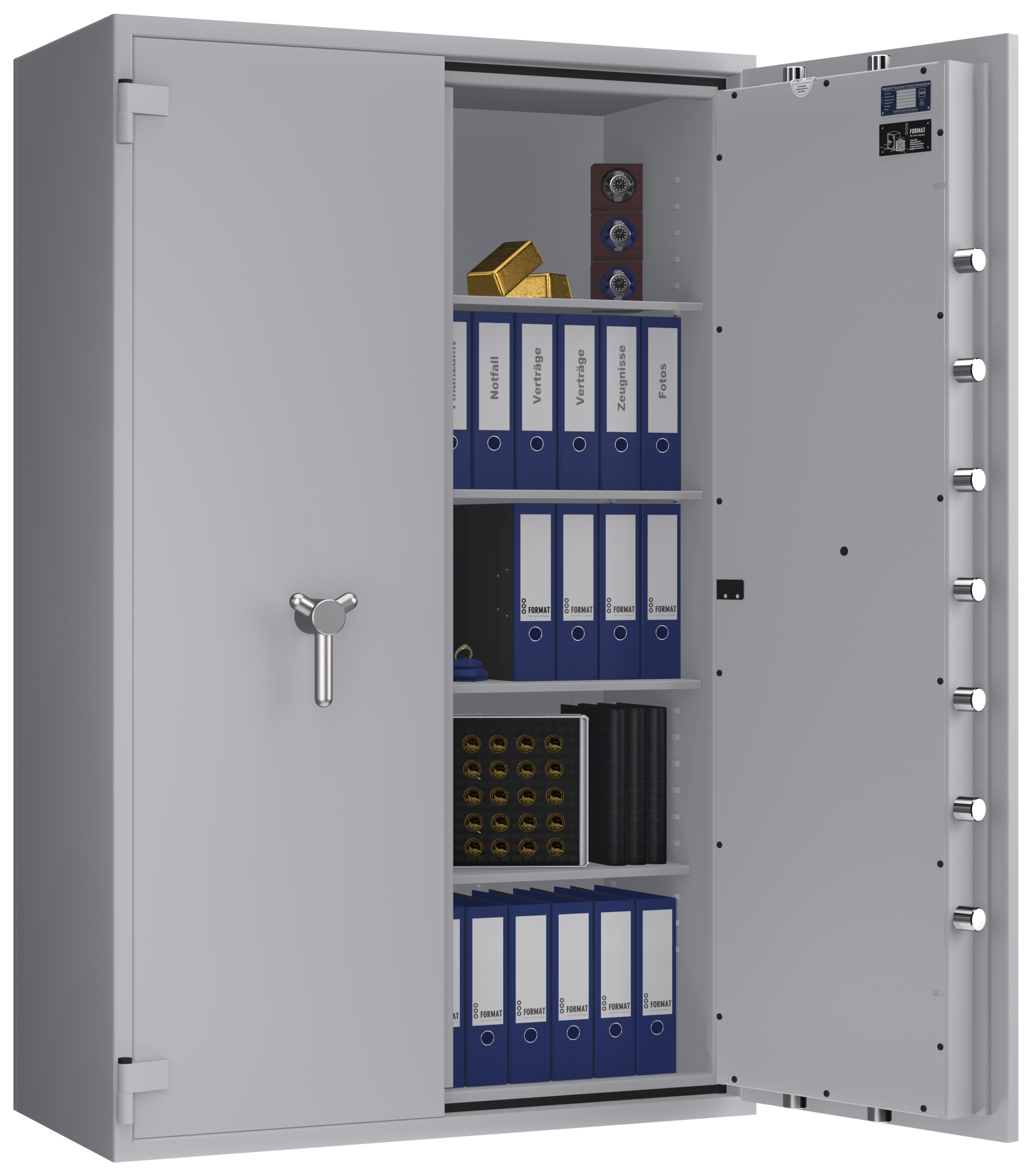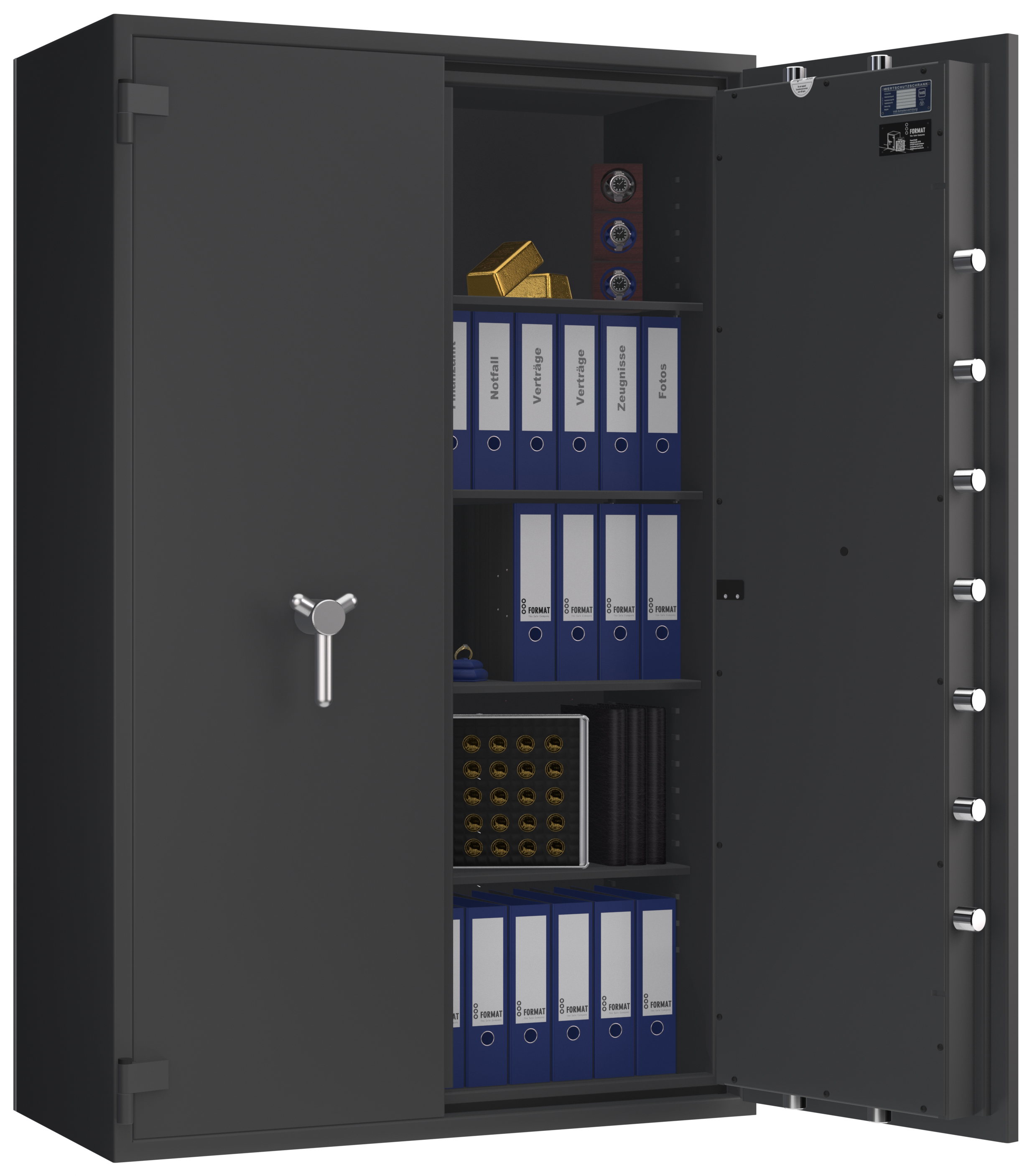 - Höchst widerstandsfähige Türfront und Korpus gegen Angriffe mit mechanischen und thermischen Einbruchwerkzeugen.