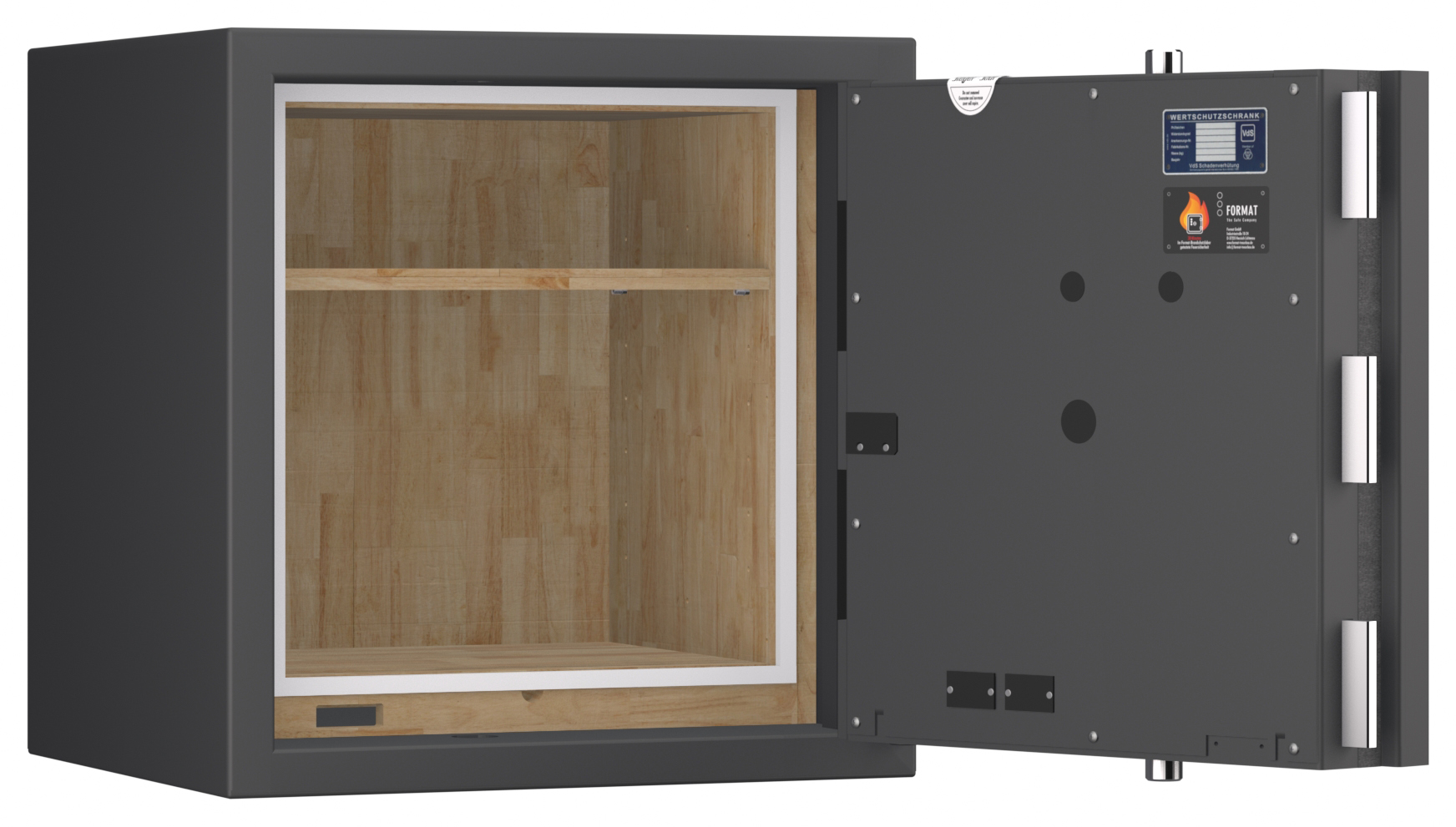 Zertifizierter Wertschutzschrank gem. Widerstandsgrad IV nach EN 1143-1 mit zusätzlich 30 Minuten Brandschutz für Papier und Dokumente. Feuerhemmende und isolierende Werkstoffe sowie Spezialdichtungen im Rahmen der Tür ergeben die im FORMAT-Brandschutzlabor getestete Brandfestigkeit bei Hausbränden.